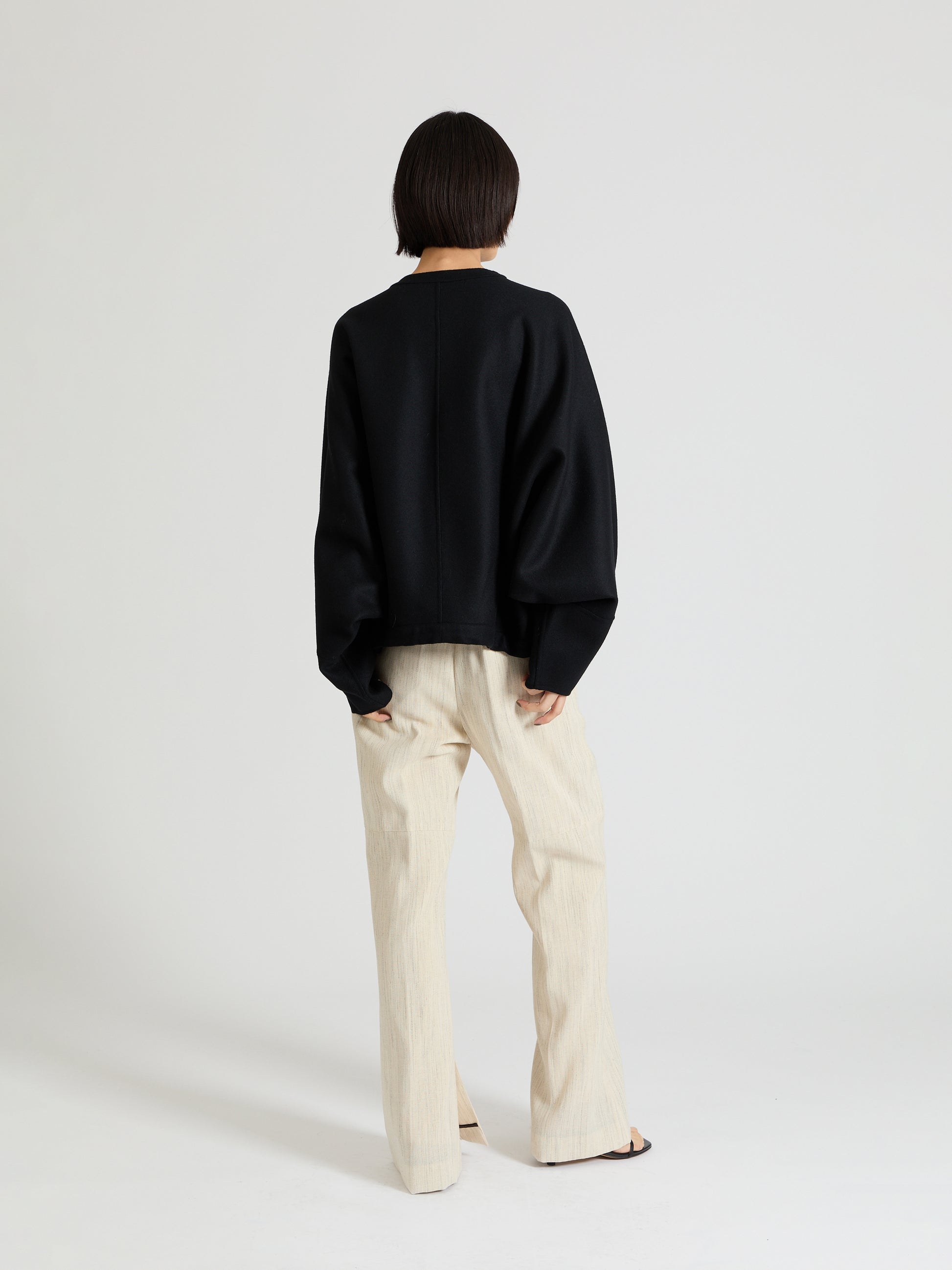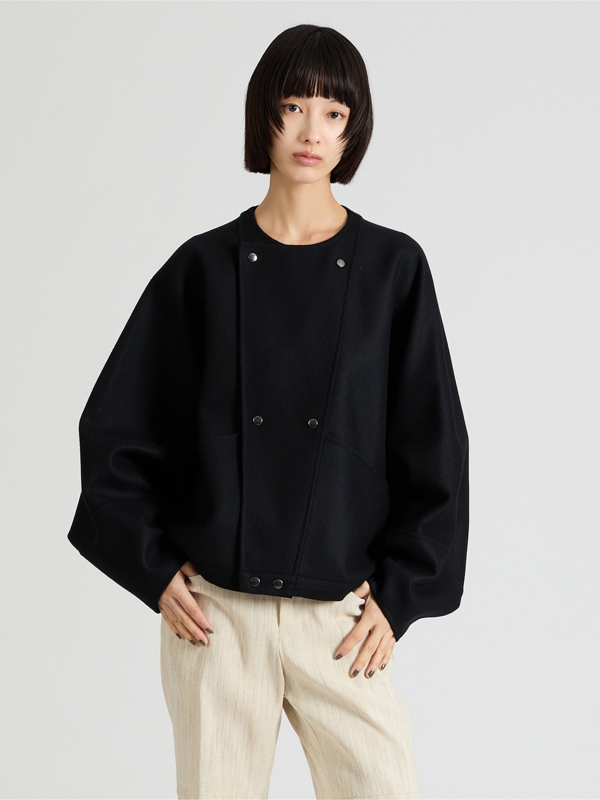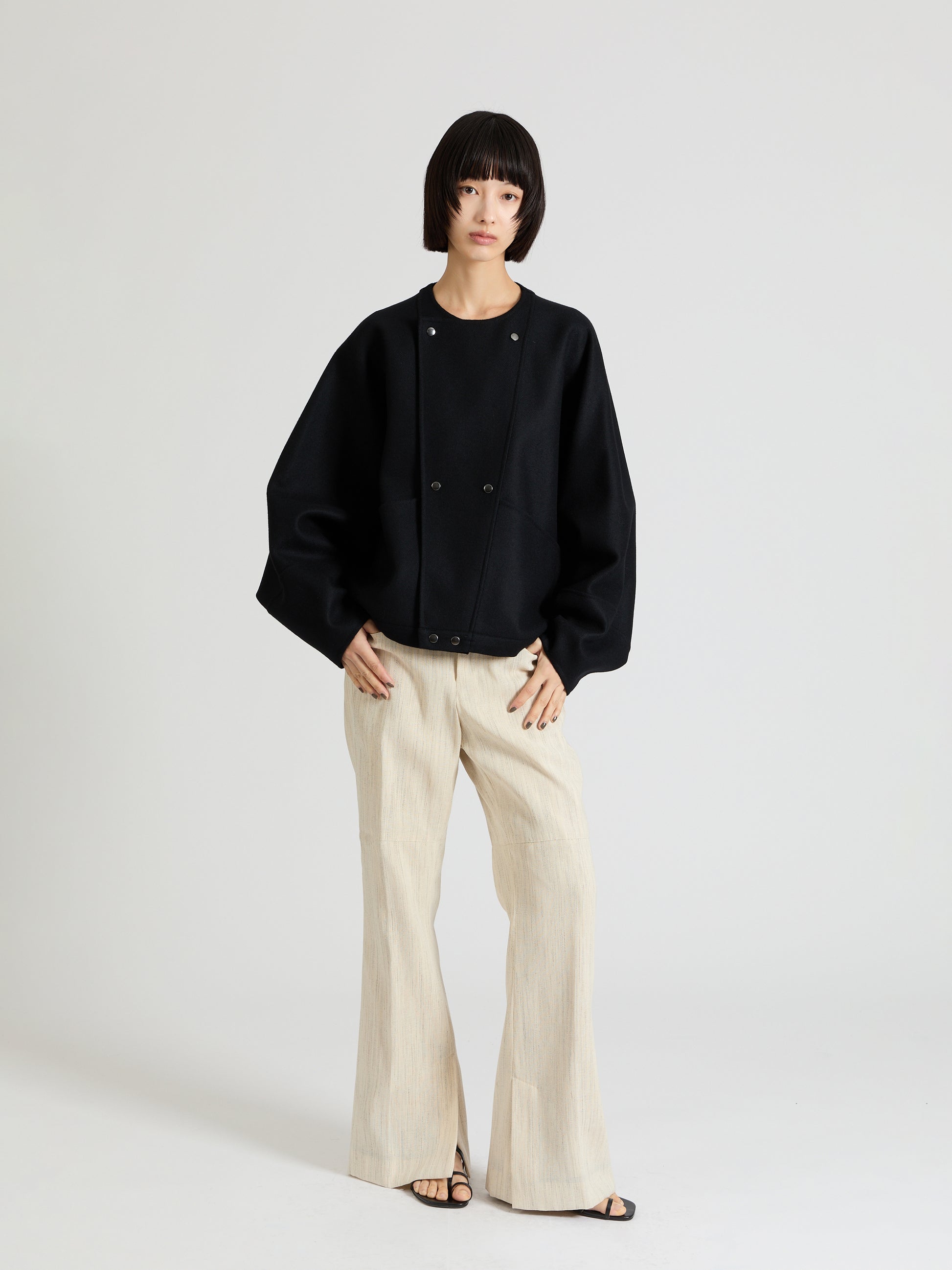 This clerical coat is based on a trench coat and is made from a sustainable material woven with a high density blend of recycled polyester and organic cotton, and is also water-repellent.