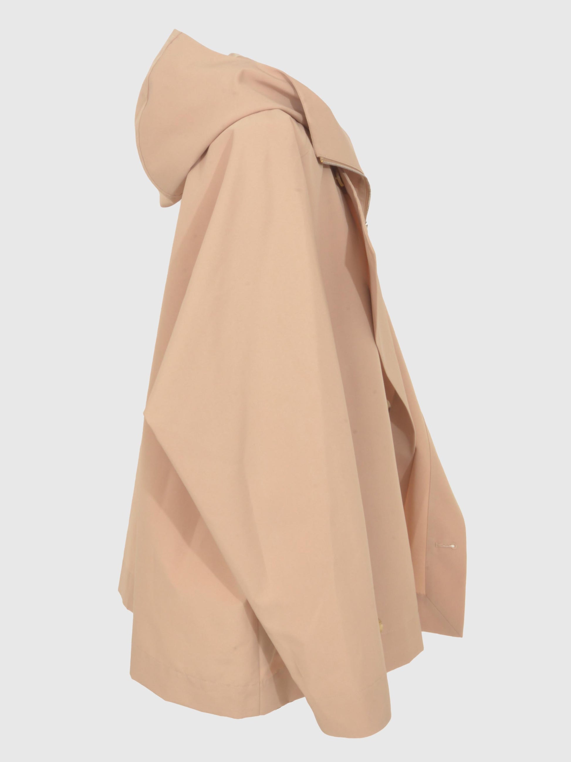 This clerical coat is based on a trench coat and is made from a sustainable material woven with a high density blend of recycled polyester and organic cotton, and is also water-repellent.