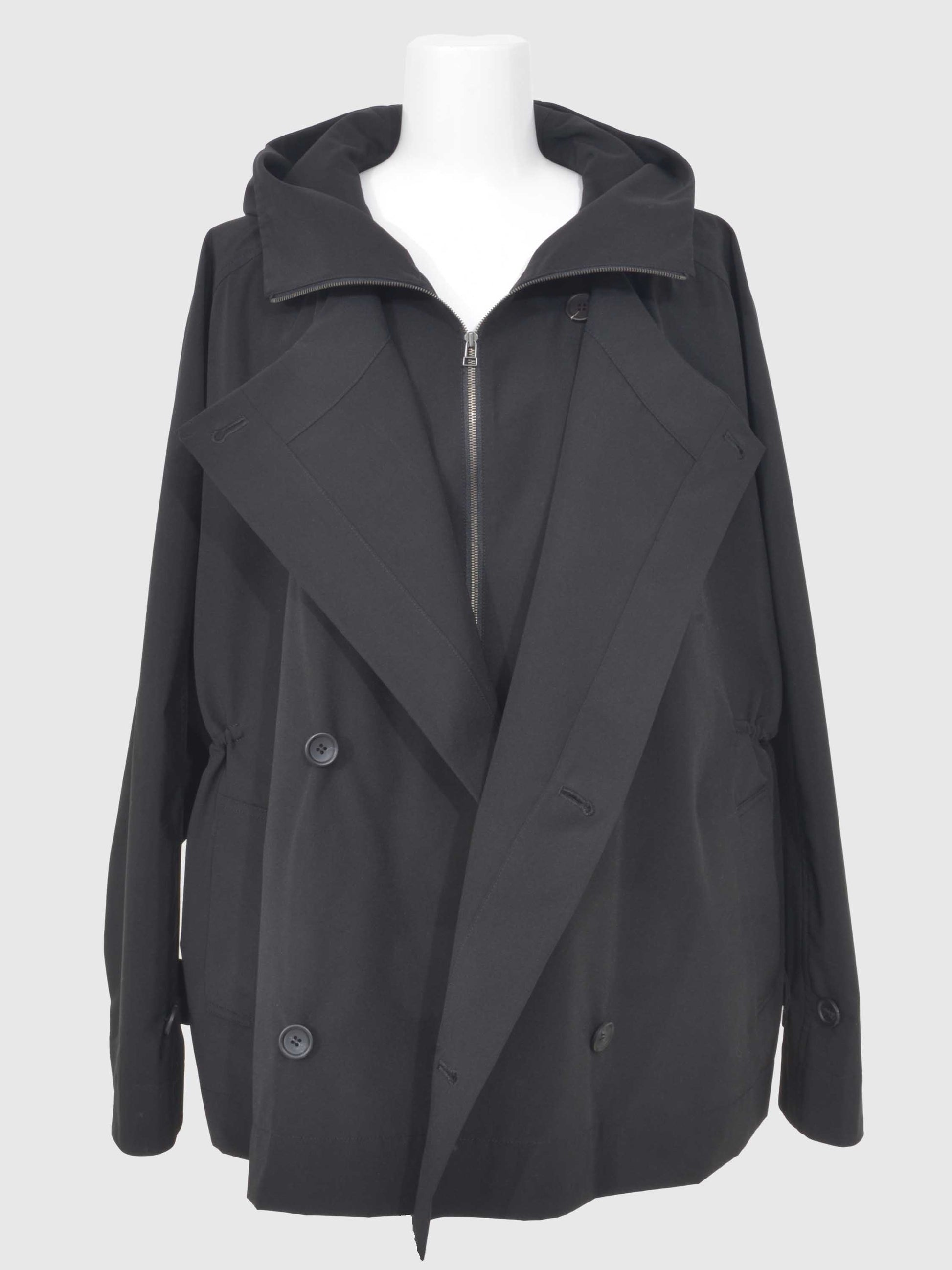 This clerical coat is based on a trench coat and is made from a sustainable material woven with a high density blend of recycled polyester and organic cotton, and is also water-repellent.
