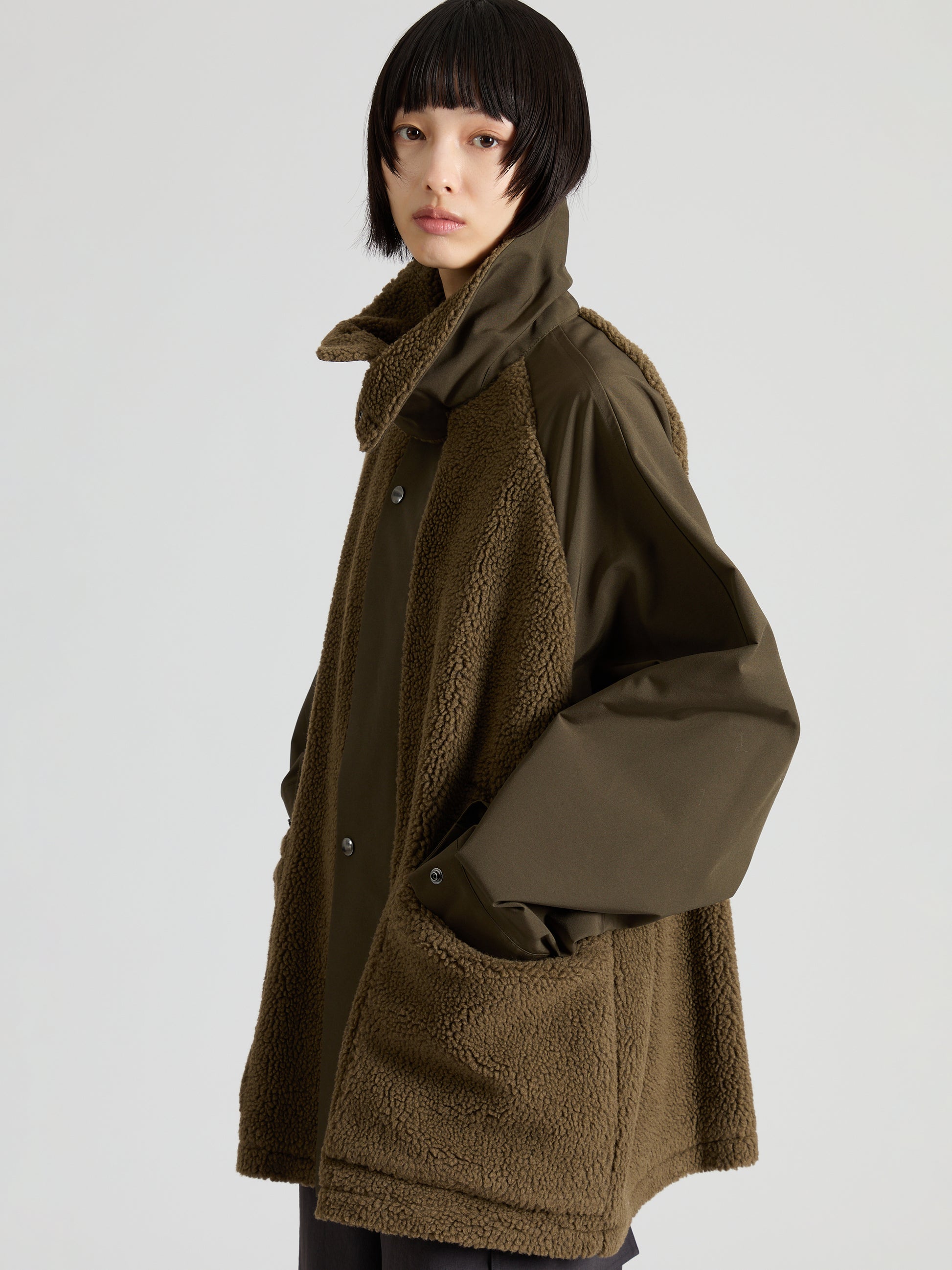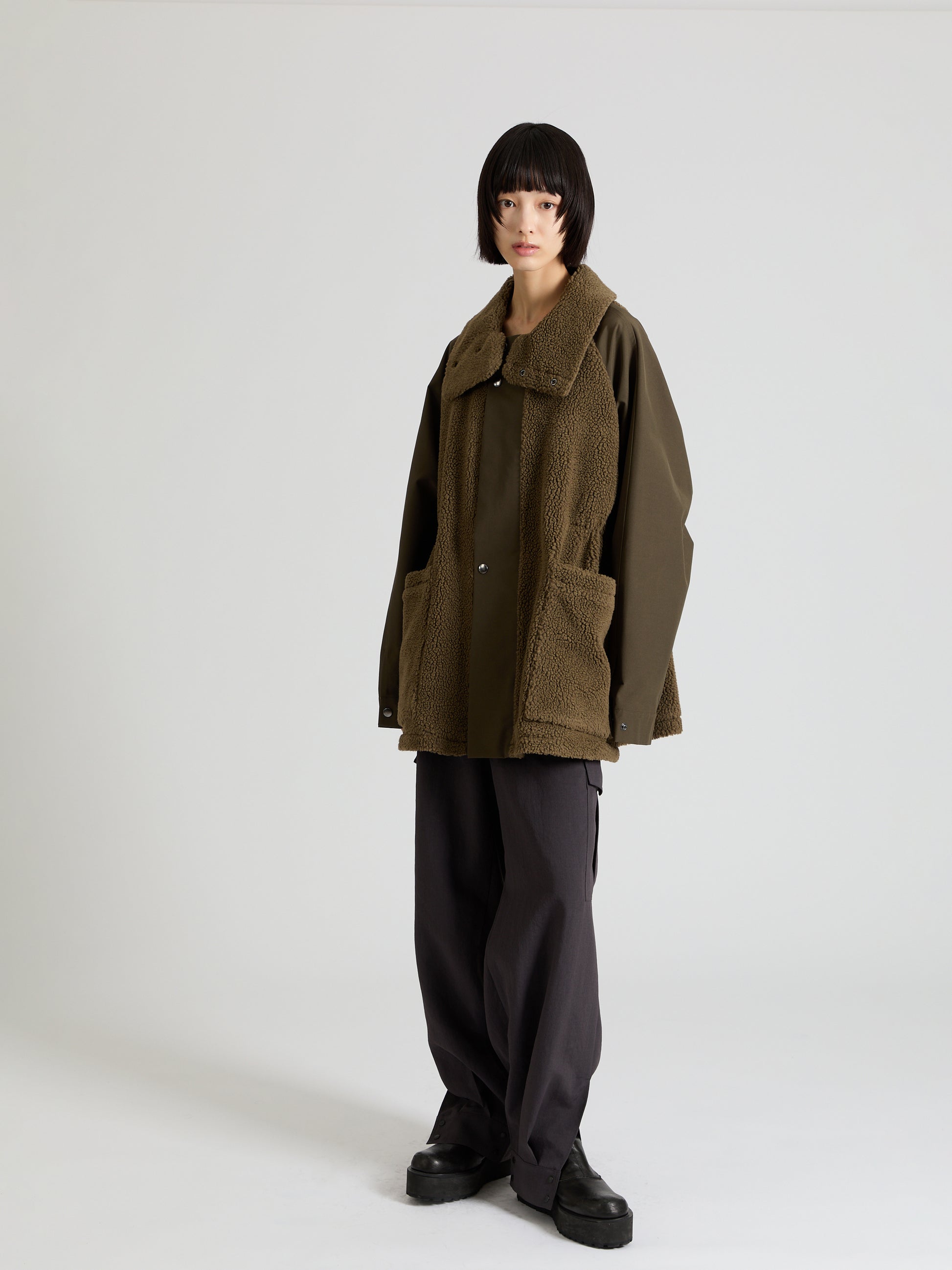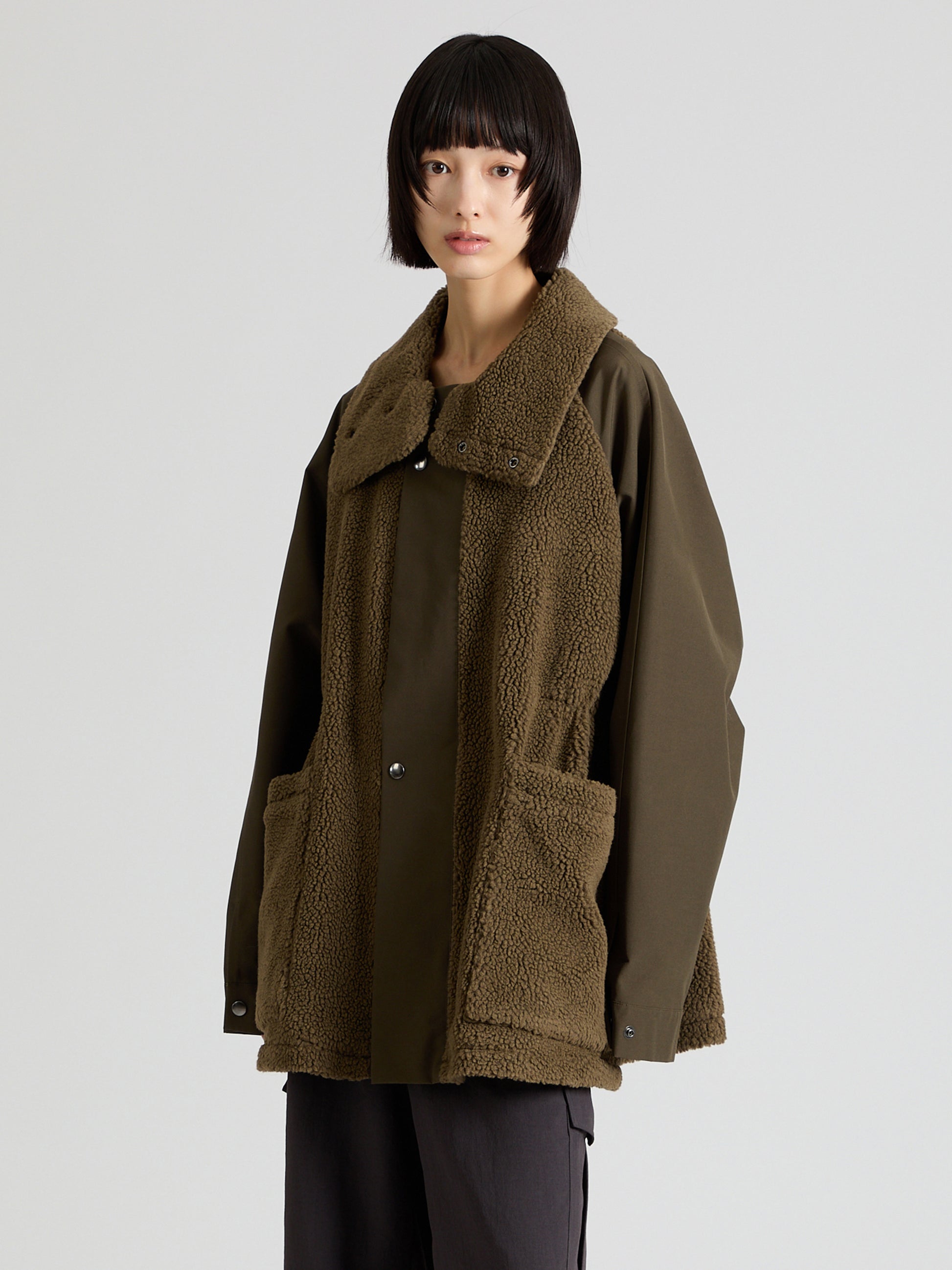 This item combines sustainable materials with warm boa material, made from a high-density woven blend of recycled polyester and organic cotton yarn with a water-repellent finish.