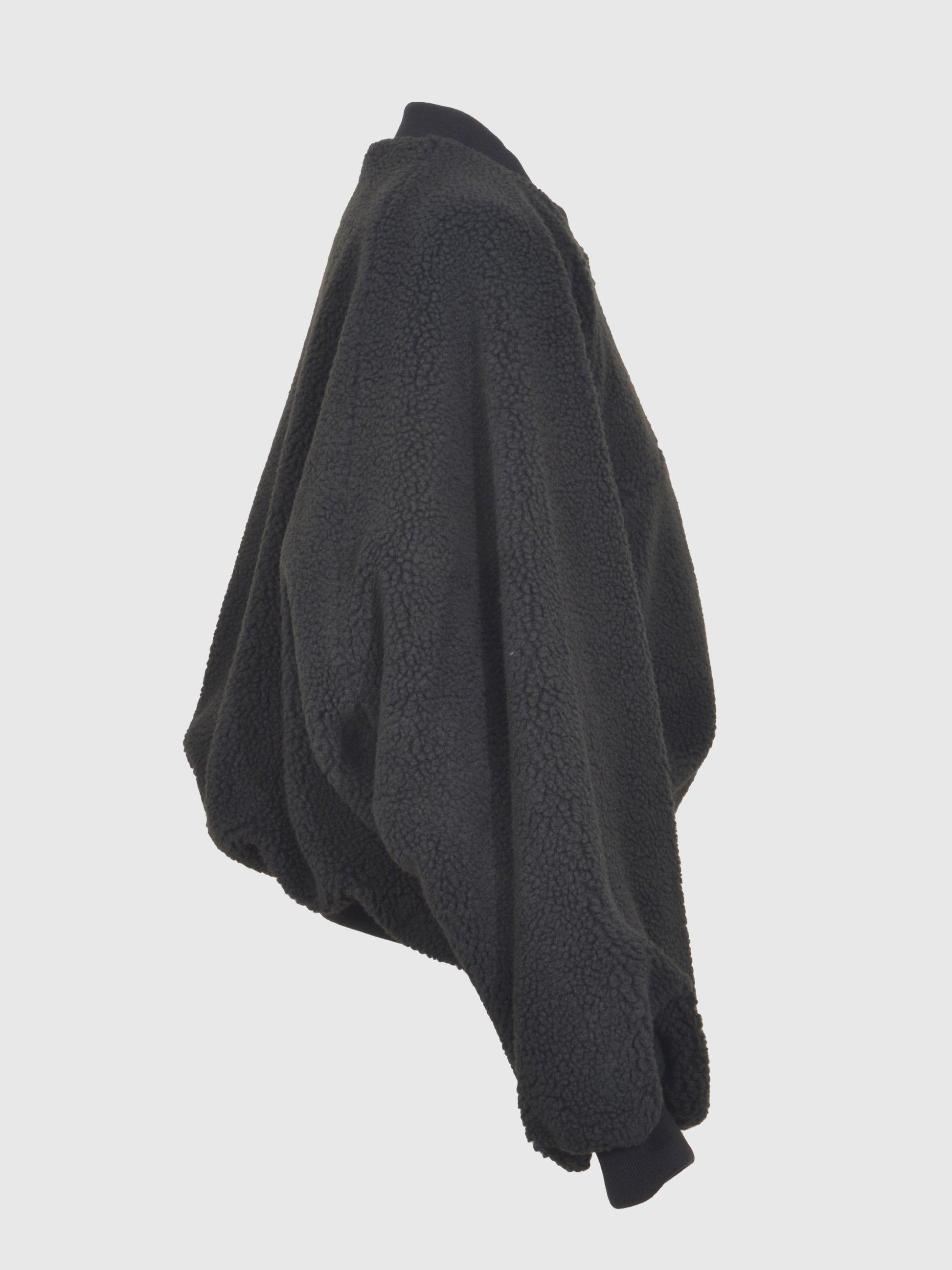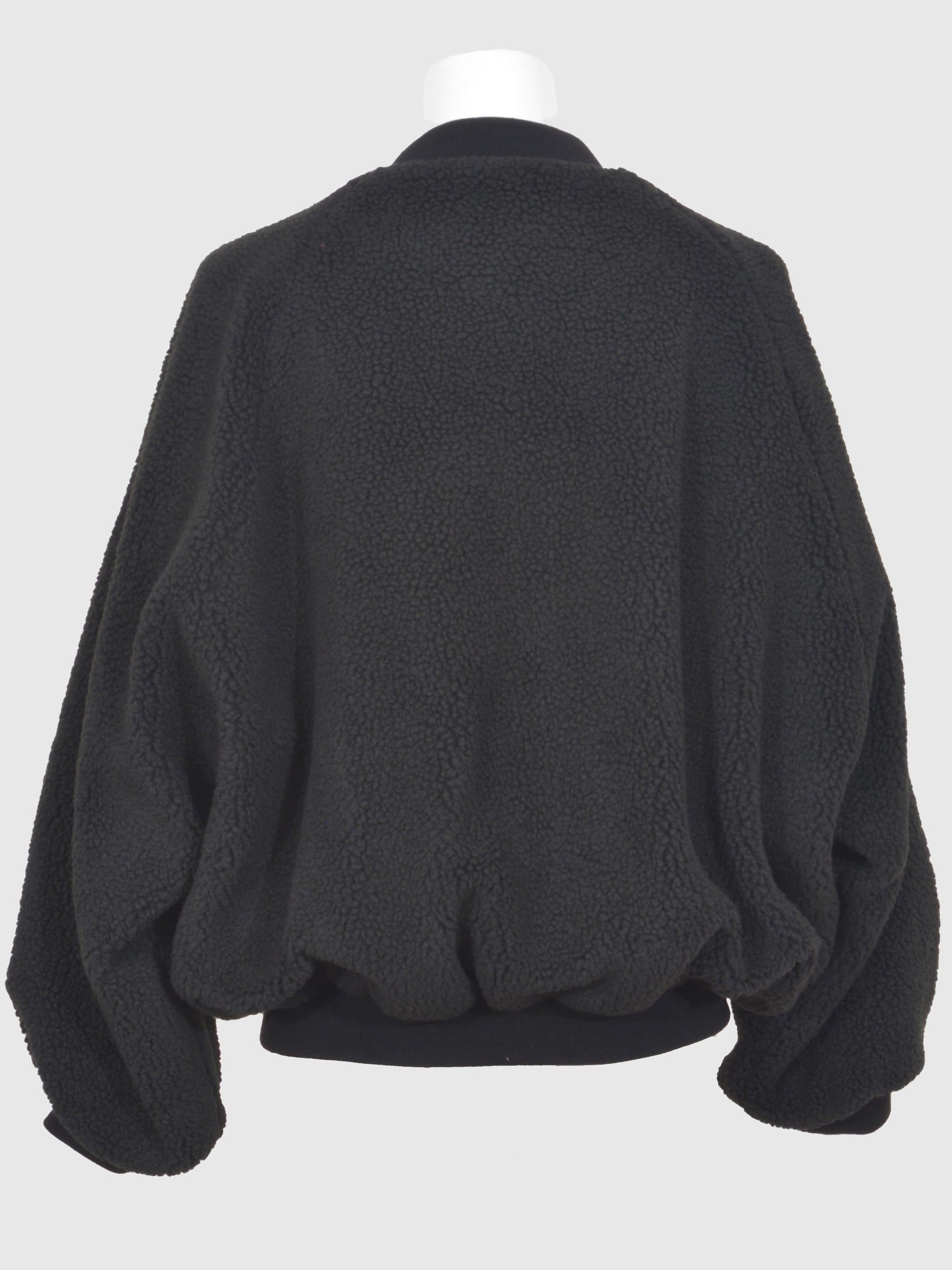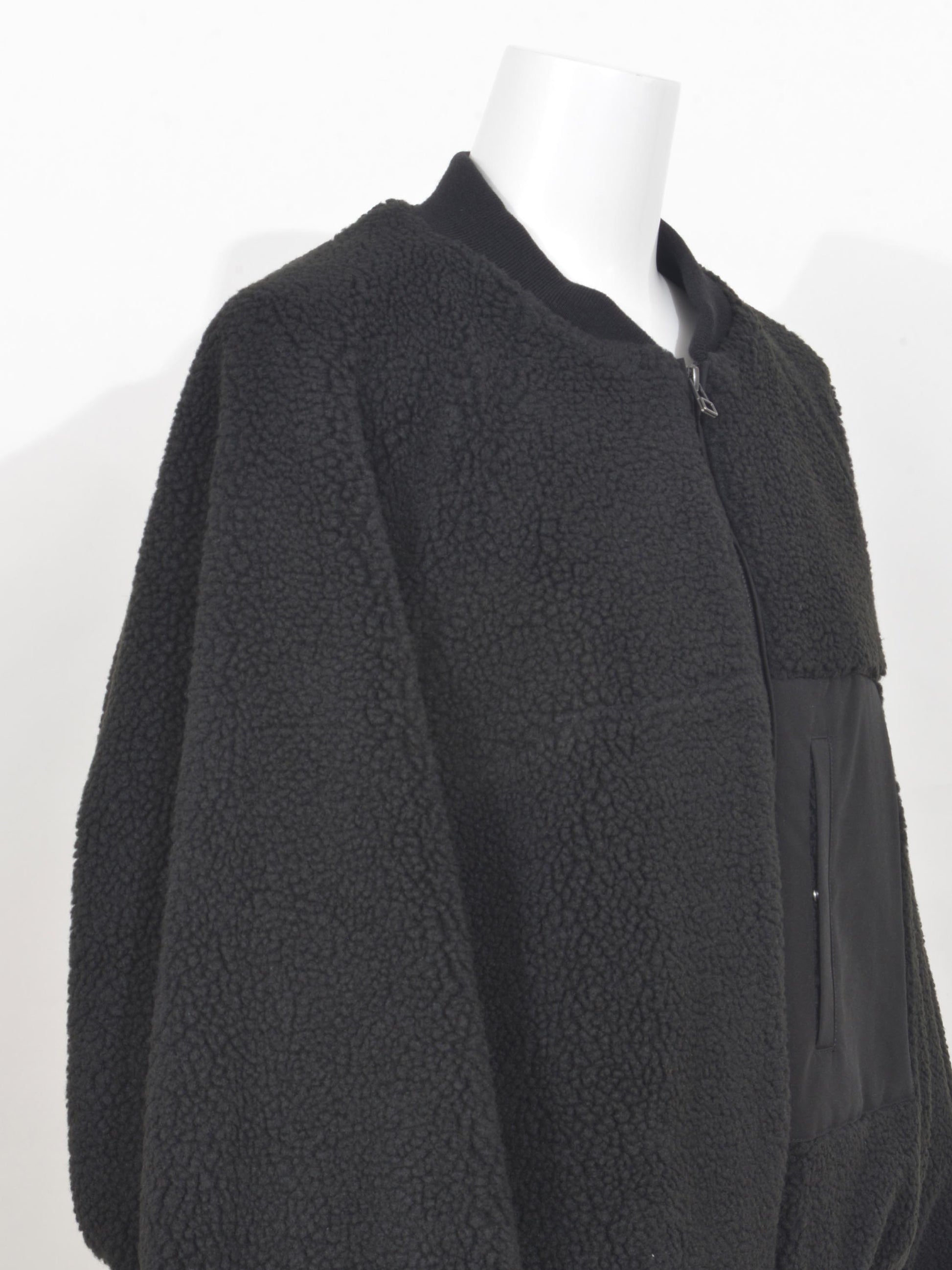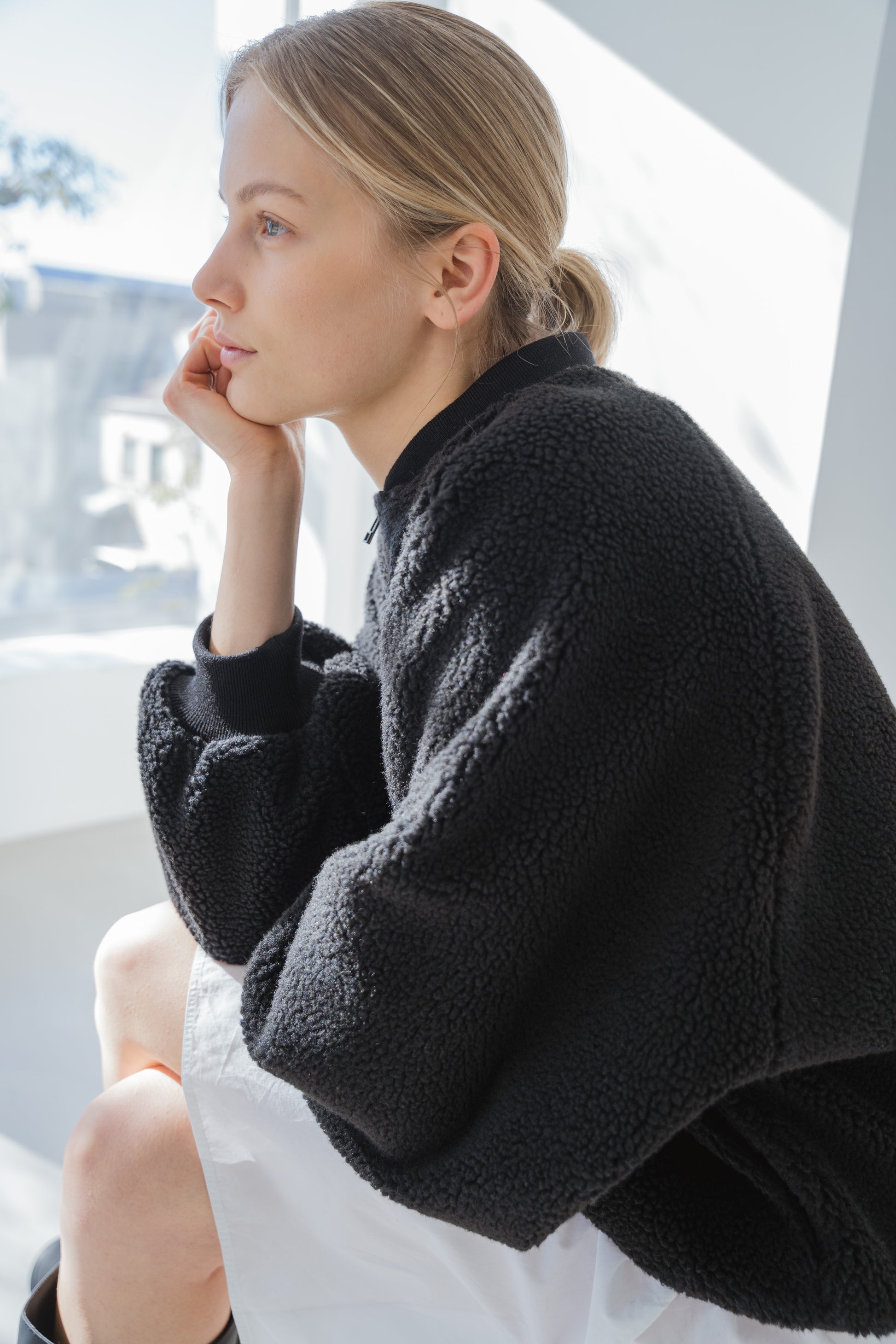 サスティナブル素材と暖かなボア素材をドッキングしたショート丈のボンバージャケットです。撥水加工を施しています。