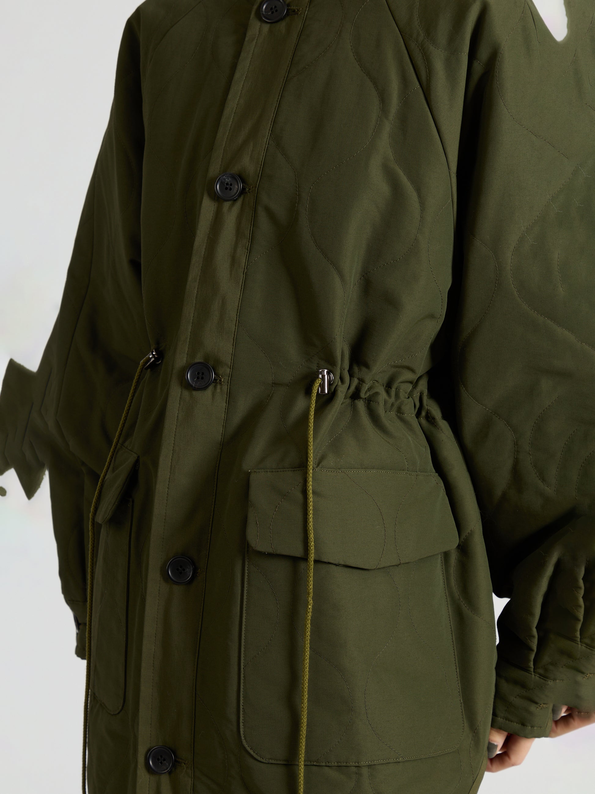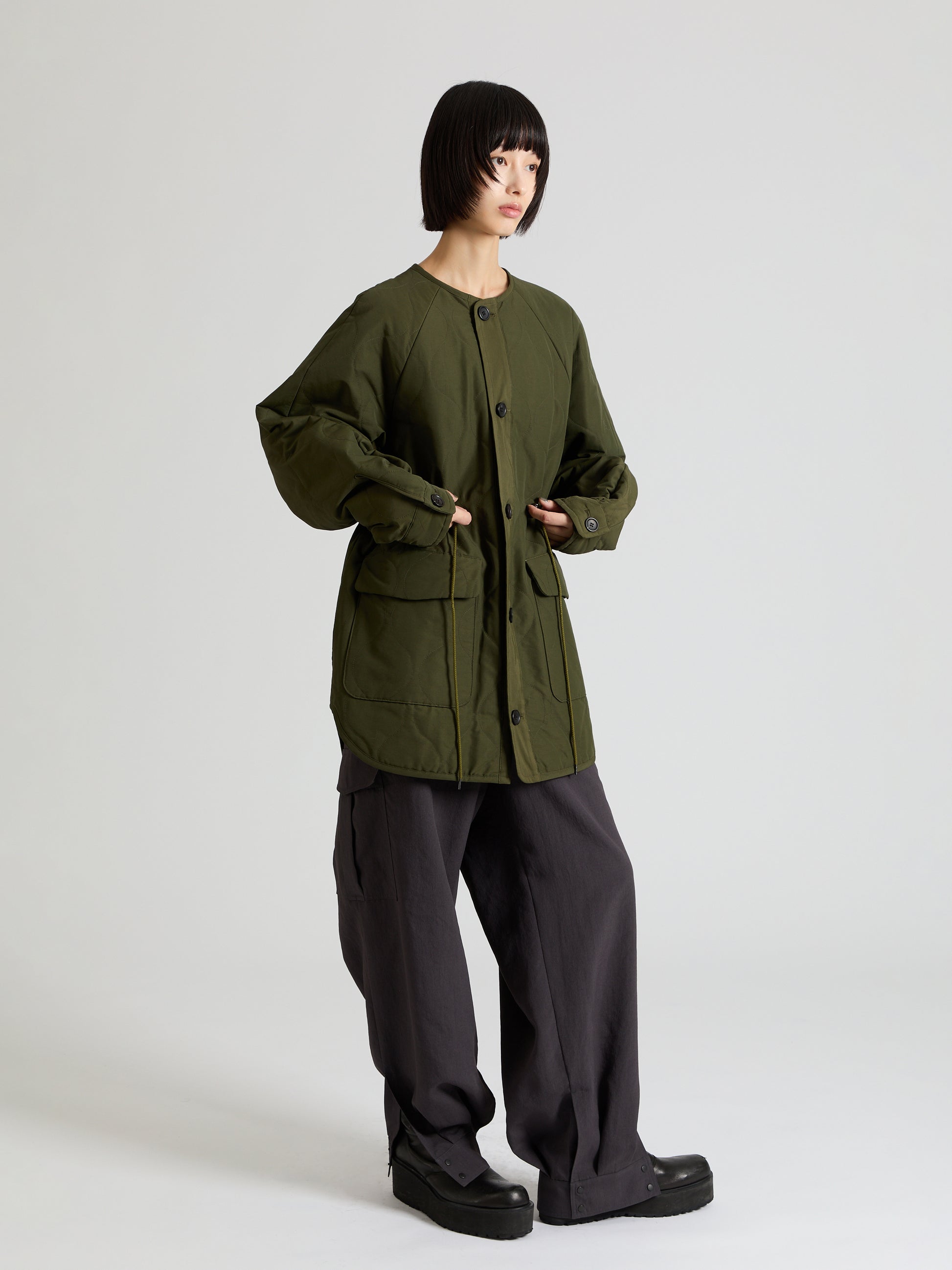 リサイクルナイロンとオーガニックコットンを高密度に織り上げた、サスティナブルグログラン素材です。撥水加工も施しています。中綿には断熱性と薄さを兼ね備えた素材を採用しています。肩のパターンメーキングが特徴で、ゆったりとした袖上と、すっきりとした袖口のバランスが新たなバランス感覚の一着です。インナーデザインをアウターに落とし込んだデザインは、幅広い季節に着用が可能です。
