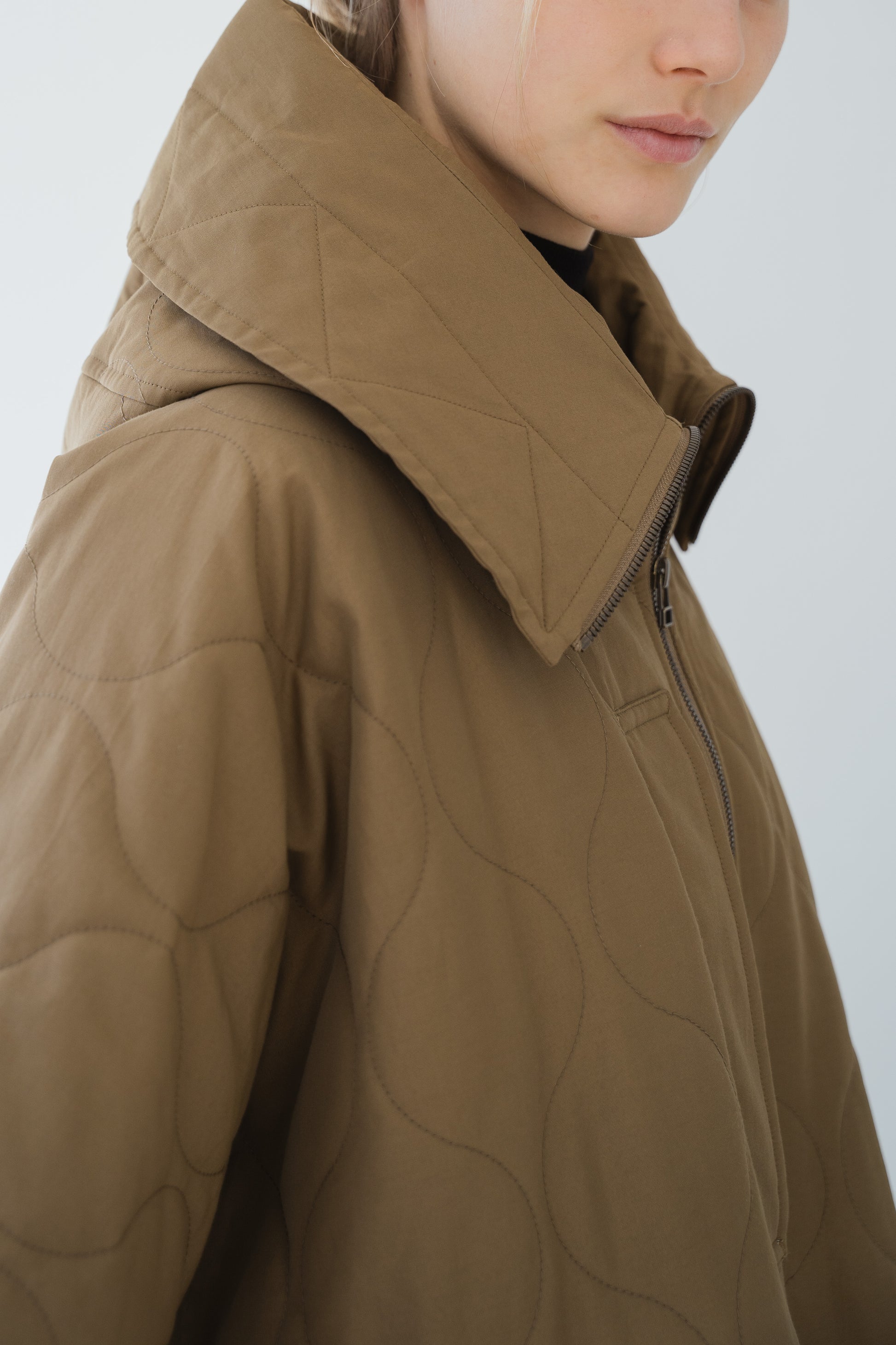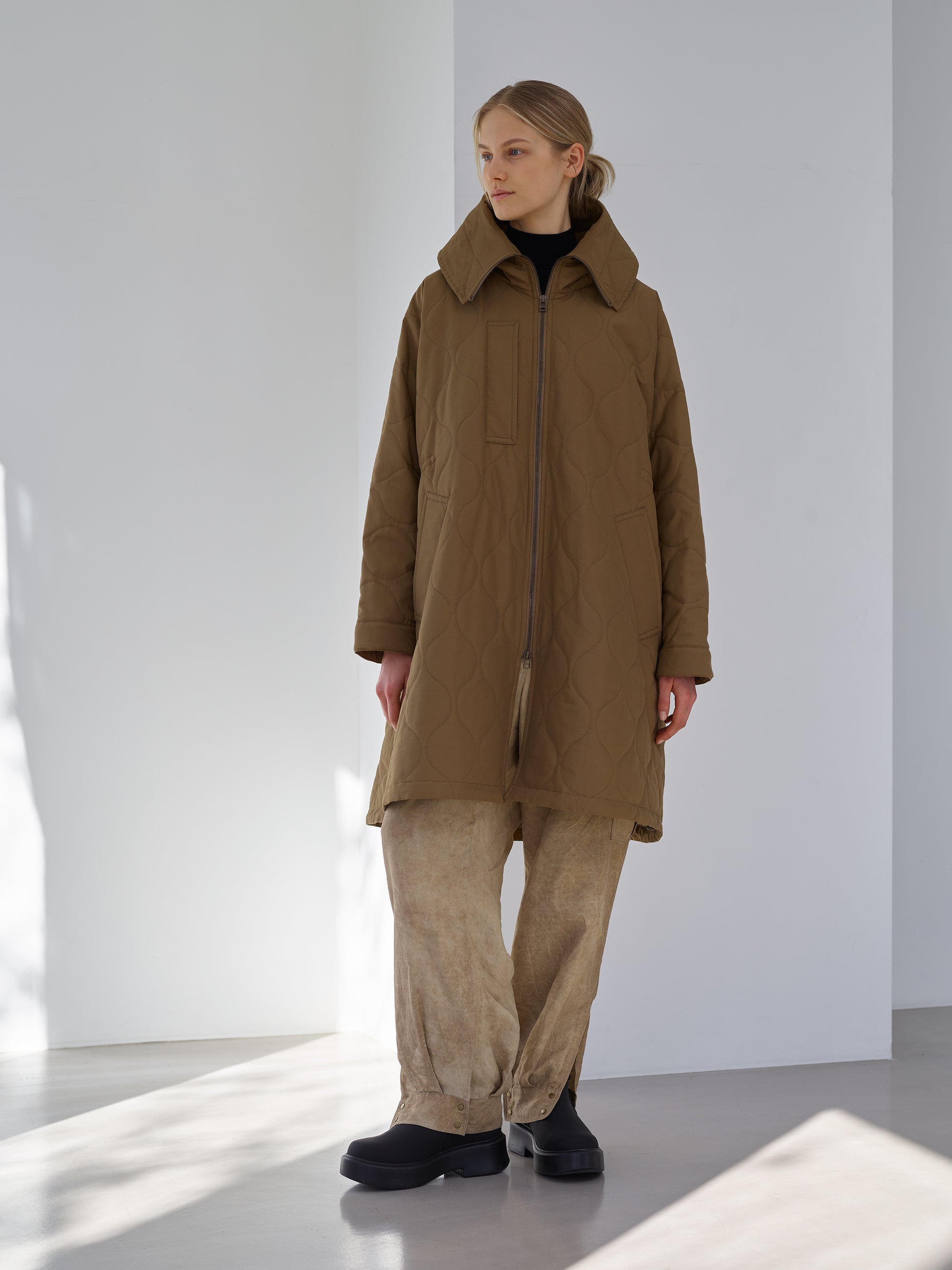 M-51のシンプルなフーディーをニュアンスのある形に変形させました。衿元がより暖かい仕様になっています。