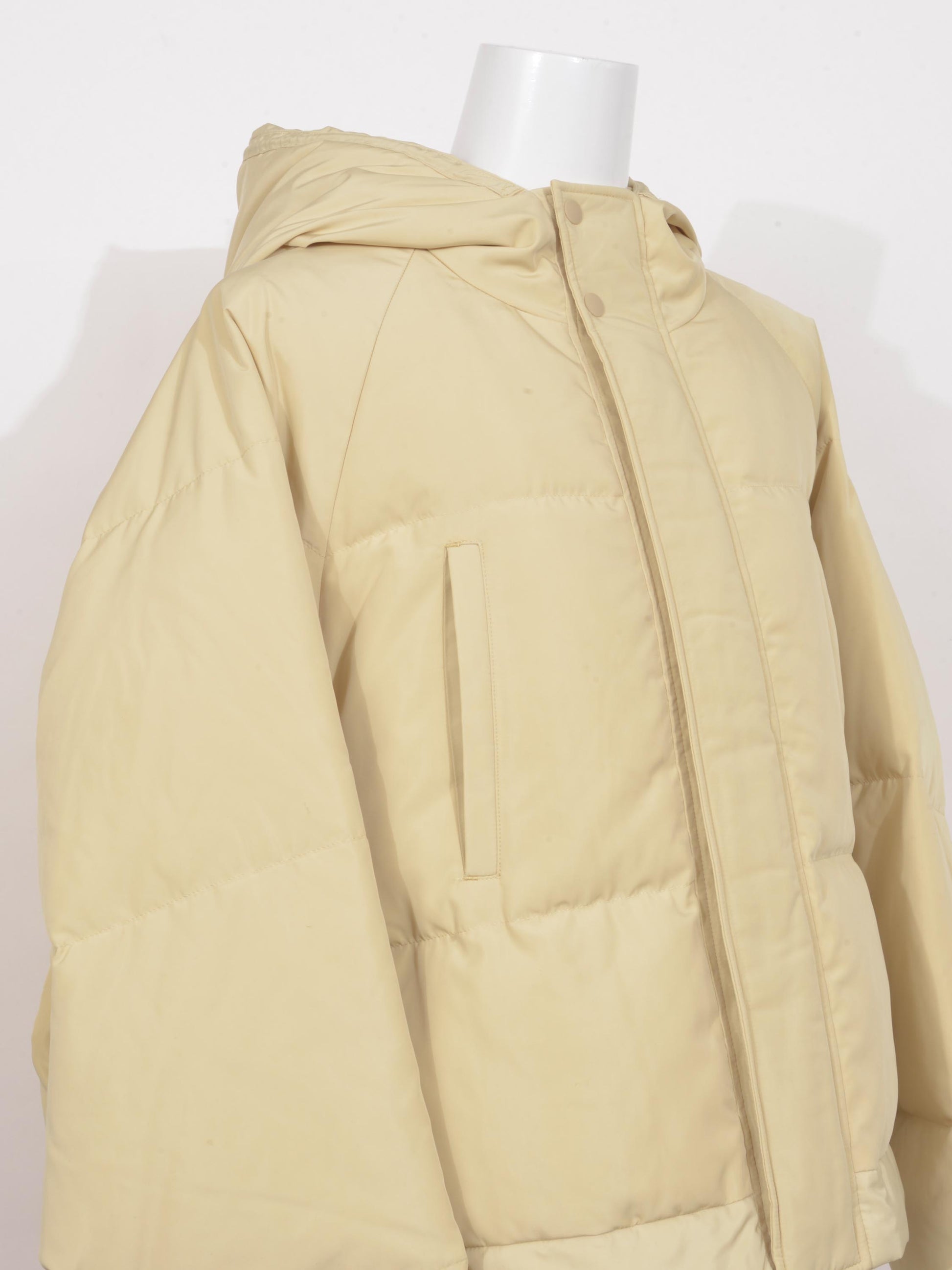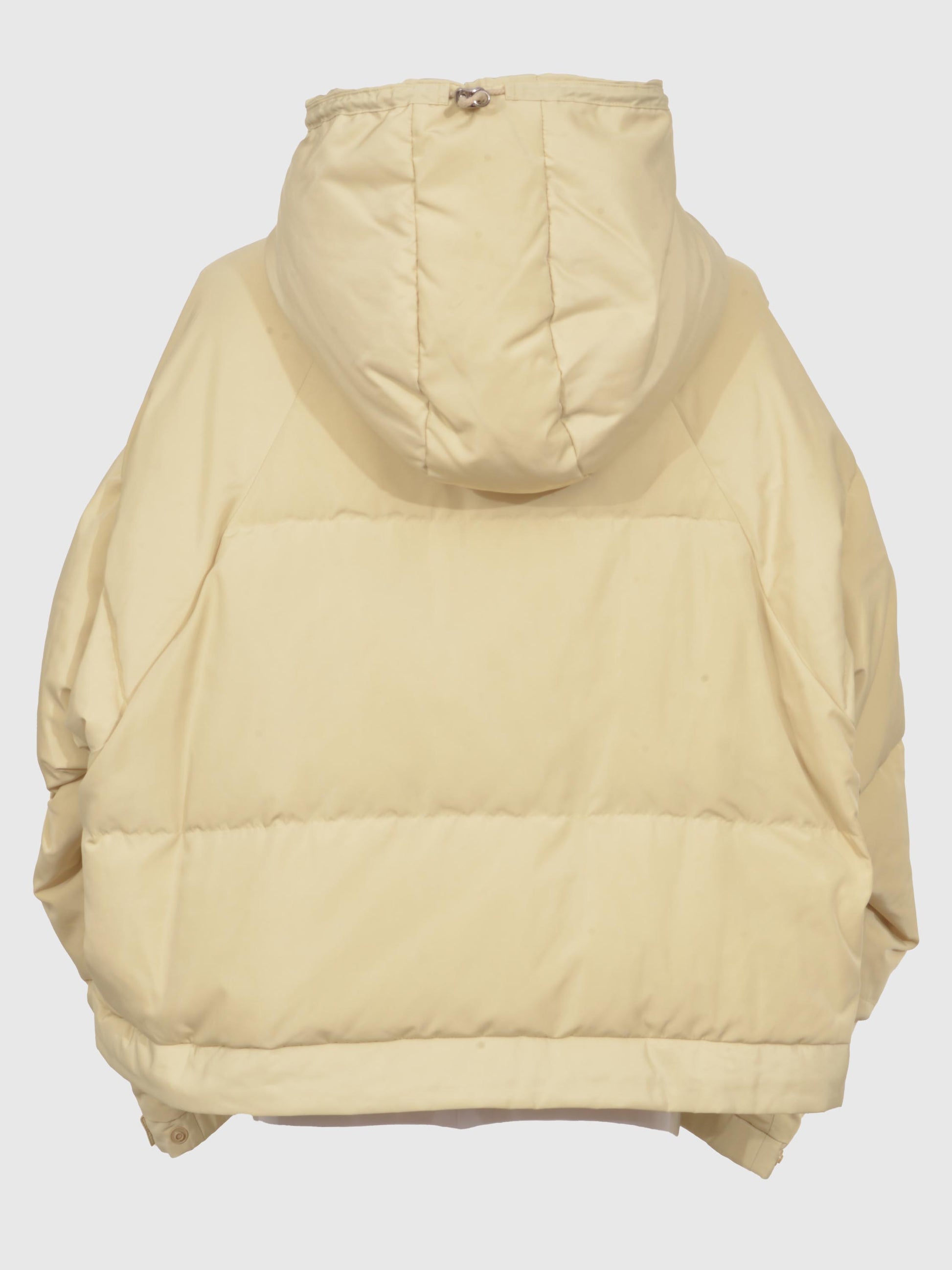 フッ素フリーによる撥水加工を施した、サスティナビリティにマッチングしたタフタを使用しています。ショート丈のフーディーをダウンで仕上げました。