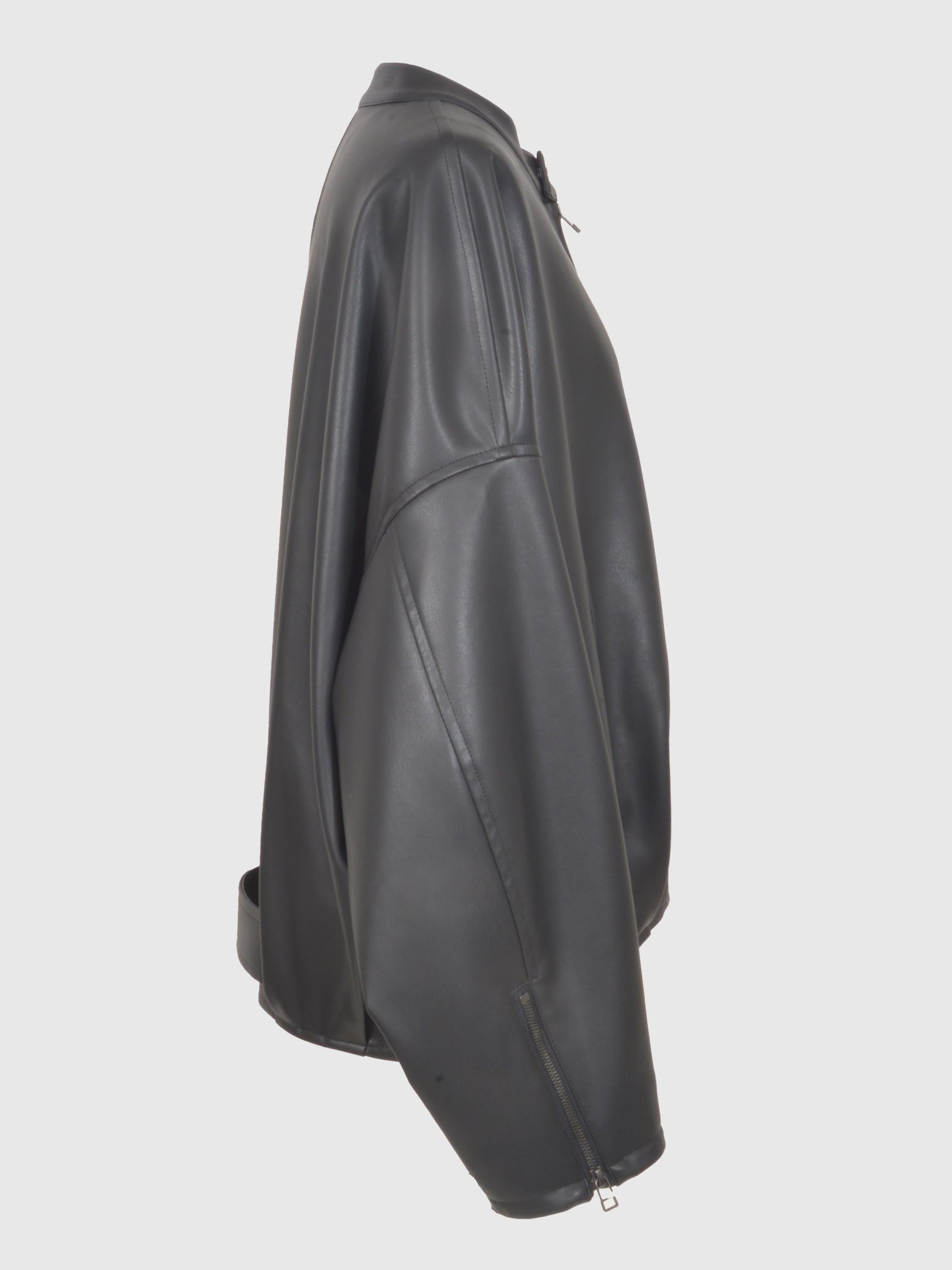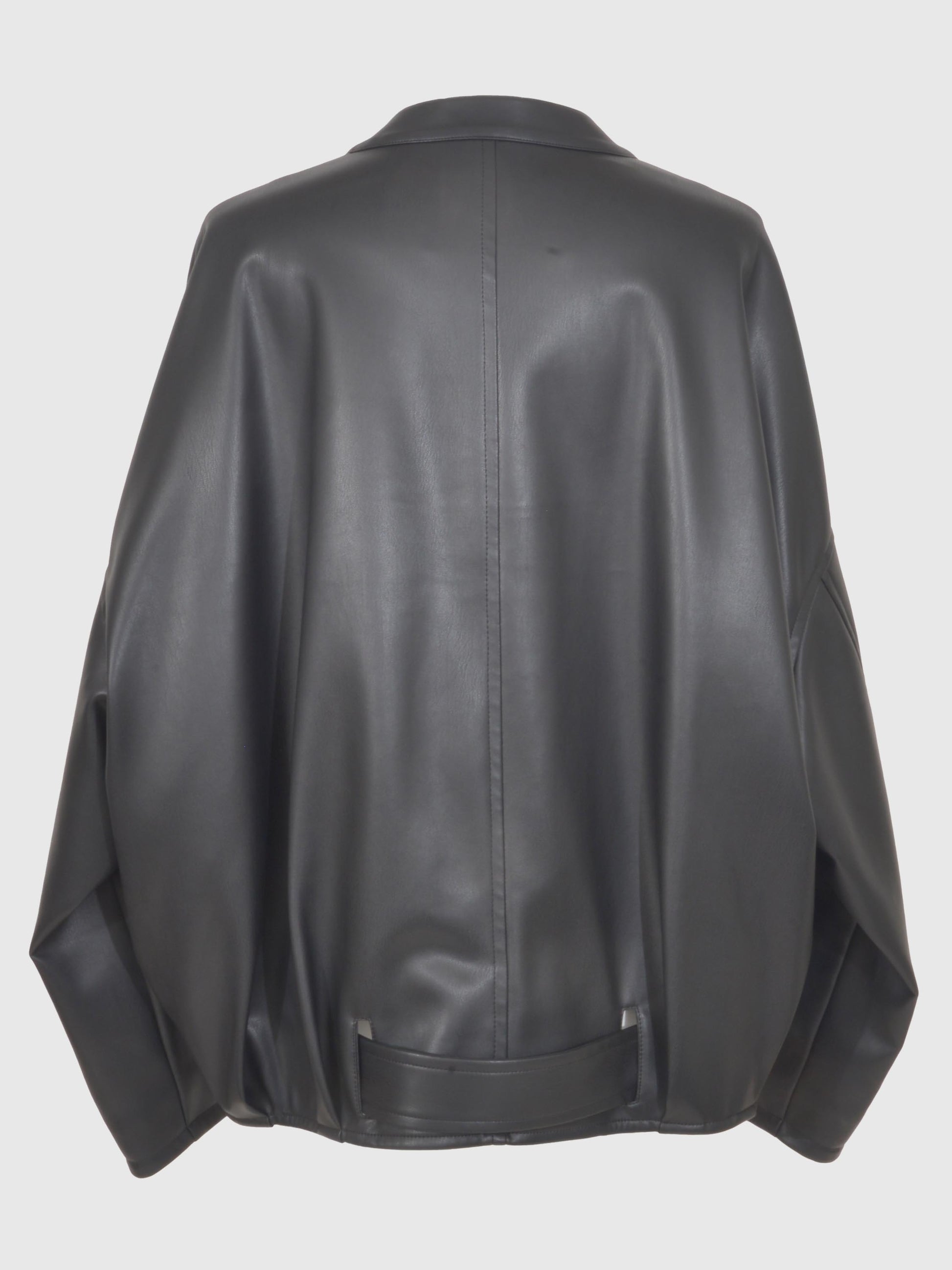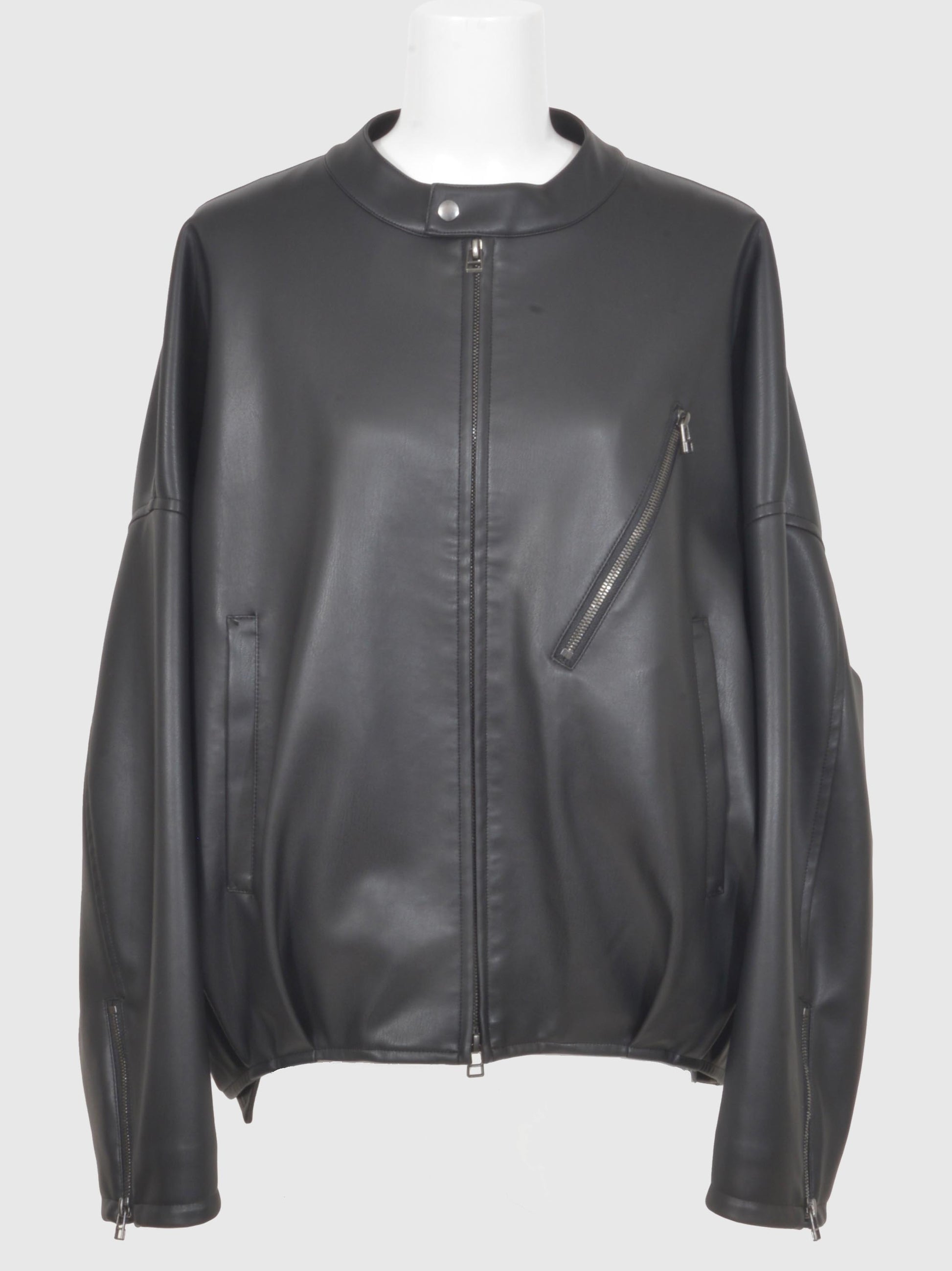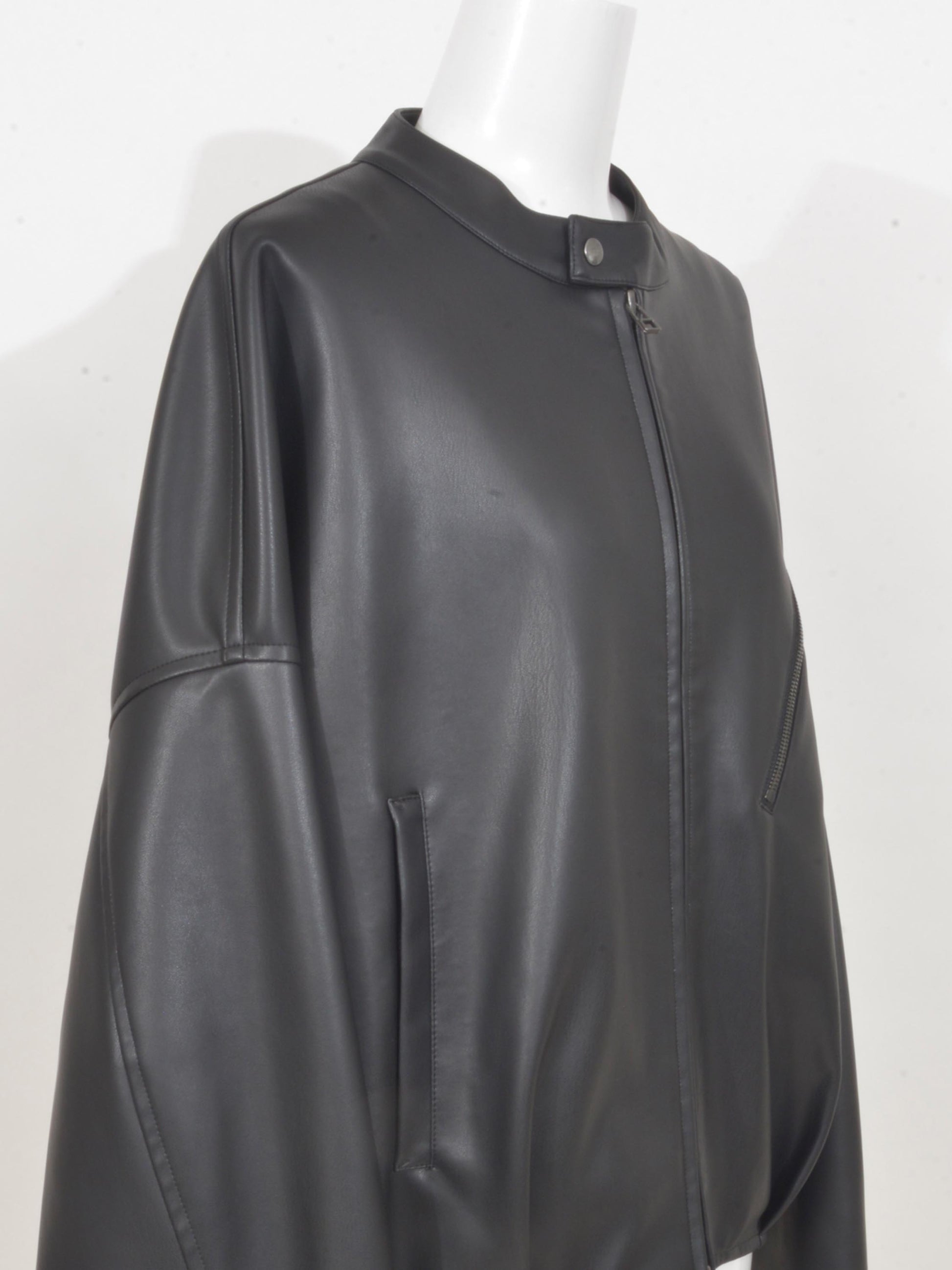 丸みを帯びたシルエットが特徴のライダースジャケット。表面がリアルレザーに近く、上品な艶とふくらみのある合成皮革です。