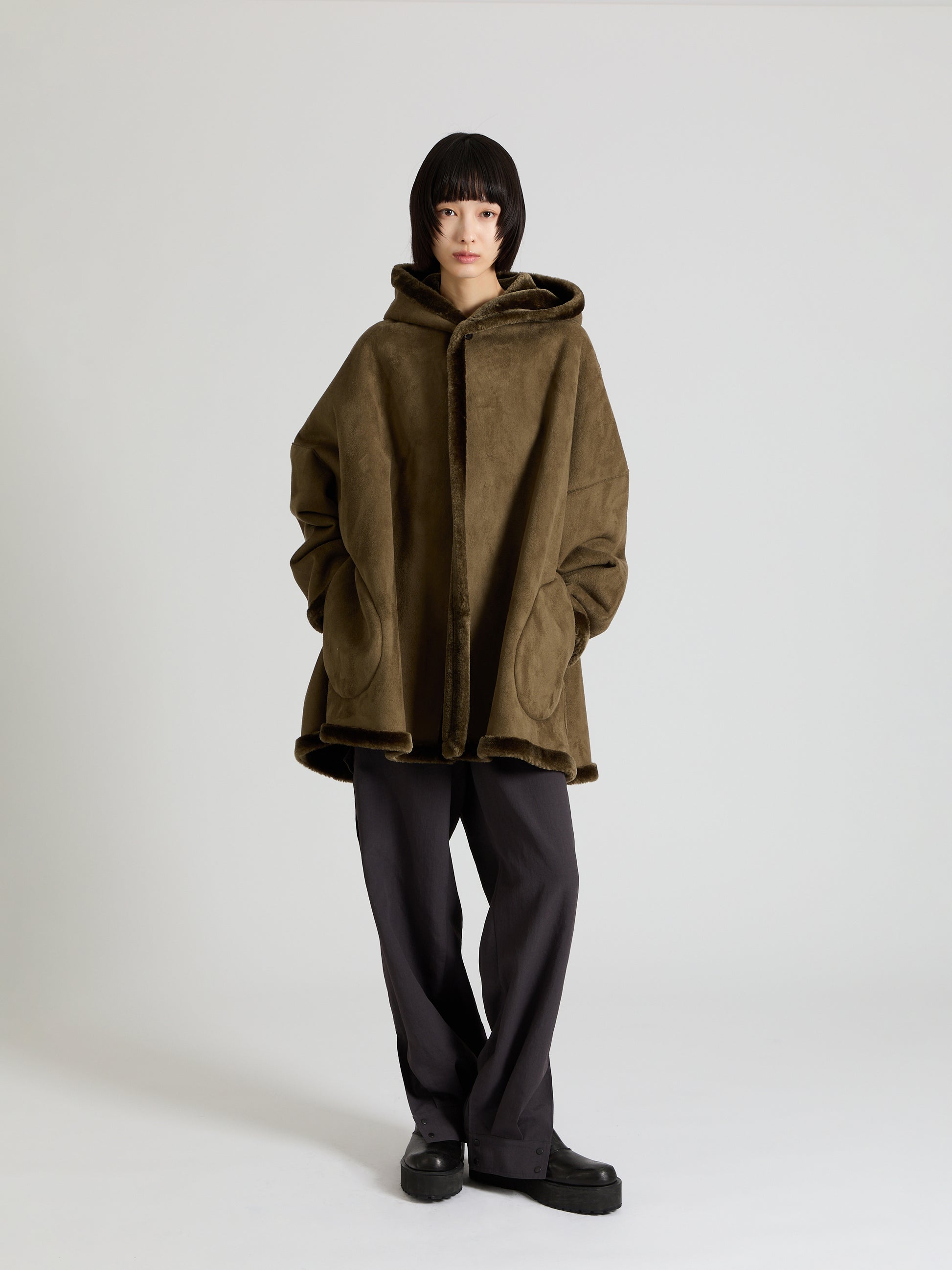 フランス生産の高いクオリティーで制作されたフェイクムートンを使用しています。軽さ、柔らかさ、手入れの容易も兼ね備えている素材です。ケープのような分量感が特徴のシルエットになっています。ファーミシンを使用し、縫代が裏に出ないキレイな仕上がりになっています。襟元に1個のボタンで止めて着用するデザインです。