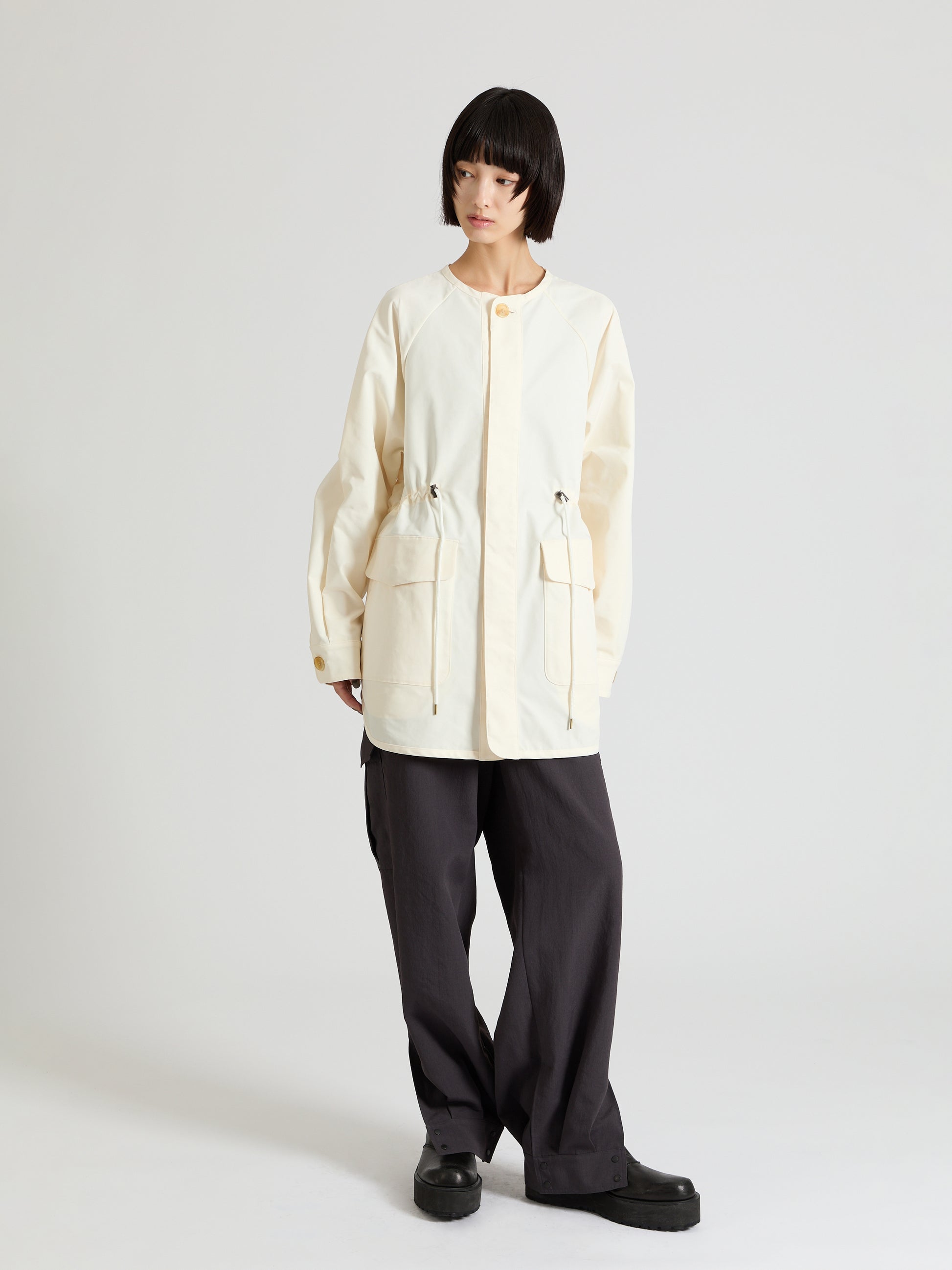 グログラン組織をより繊細に織り上げ、適度なストレッチ性と環境に配慮した非フッ素撥水加工を施した機能性のある生地を使用しています。肩のパターンメーキングが特徴で、ゆったりとした袖上と、すっきりとした袖口のバランスが新たなバランス感覚の一着です。インナーデザインをアウターに落とし込んだデザインは、幅広い季節に着用が可能です。