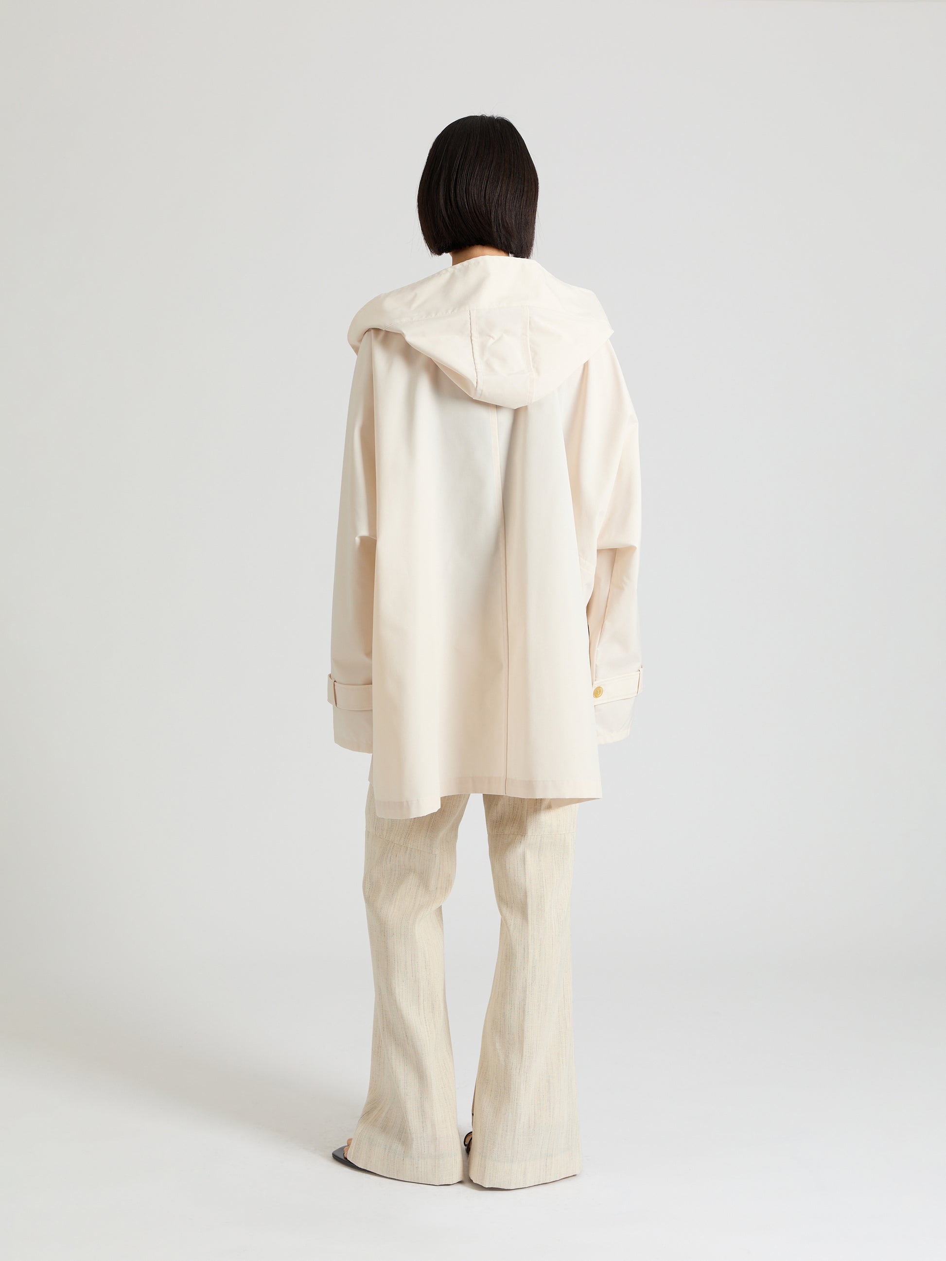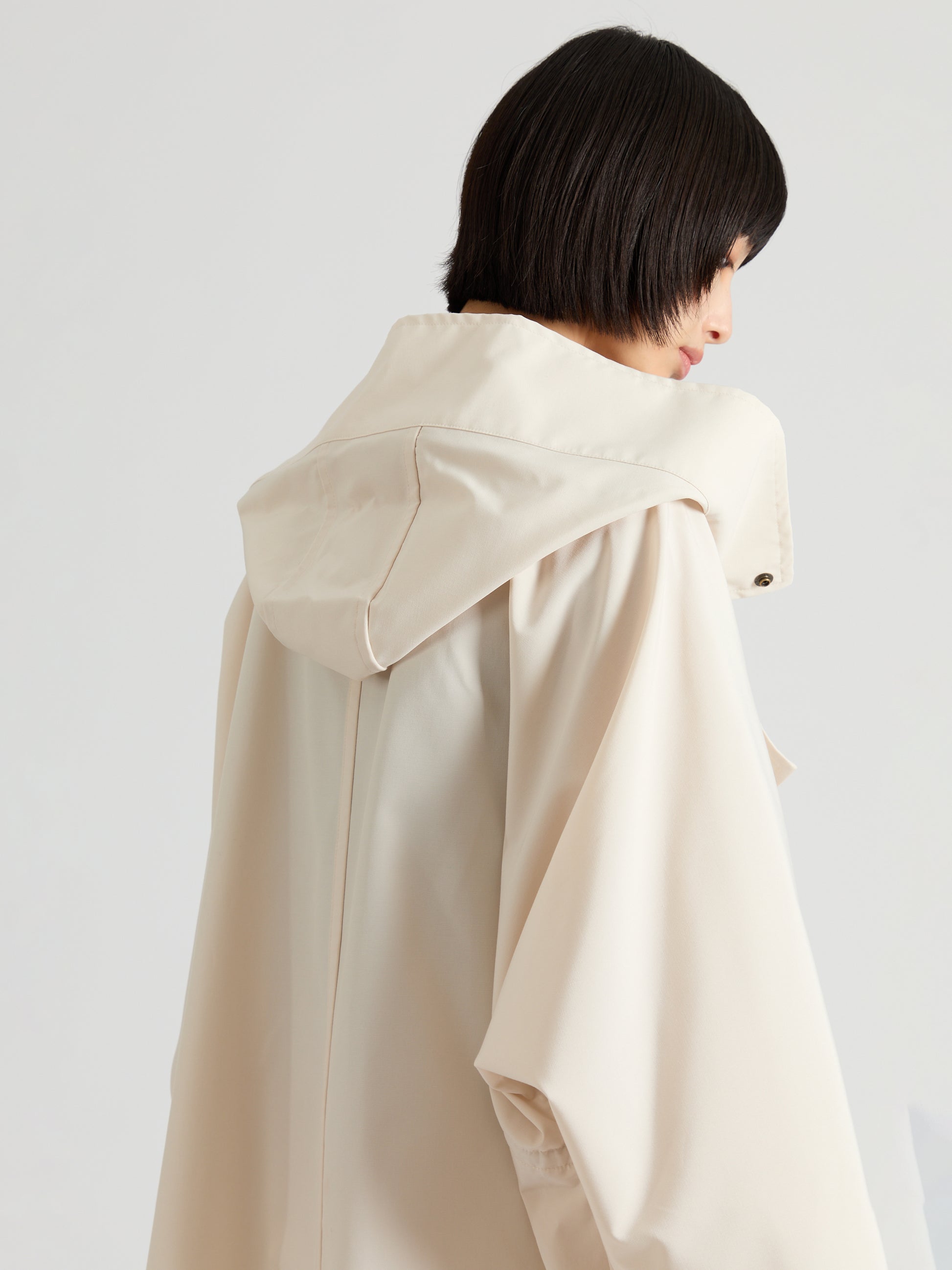 リサイクルポリエステルとオーガニックコットンの混紡糸を高密度に織り上げたサスティナブル素材で、撥水加工も施しています。高めな衿(フード)は取り外し可能で、ウエストのドローストリング、袖口のアジャストベルトでシルエットの変化も楽しめます。